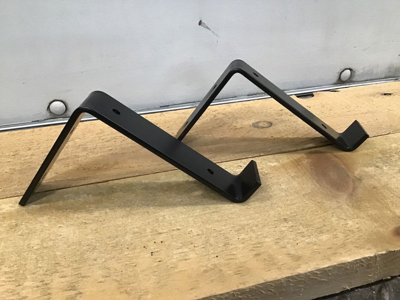Sold as a pair. Locally fabricated by a family operation. Made for a 5.5" wide shelf board. Made from bent 3/16" steel. Lipped front. Powder coated black.