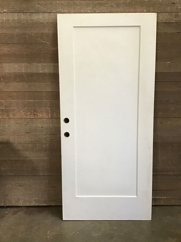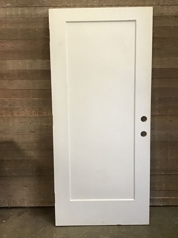 This is a wood single panel interior door with exterior door thickness. Painted white and in good condition.