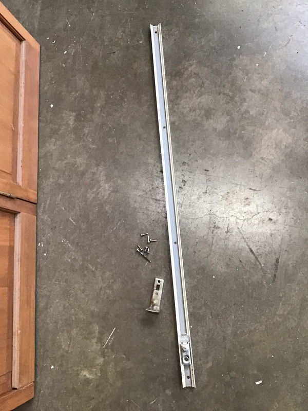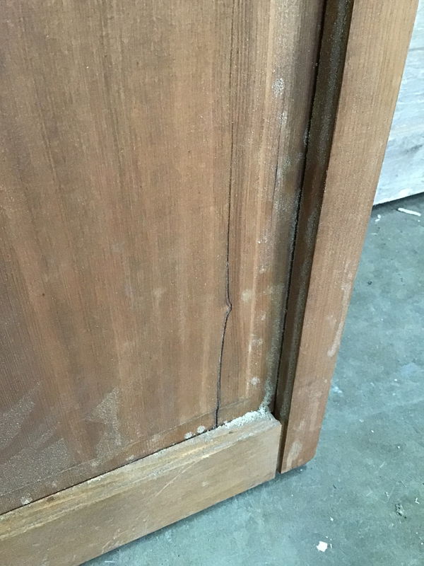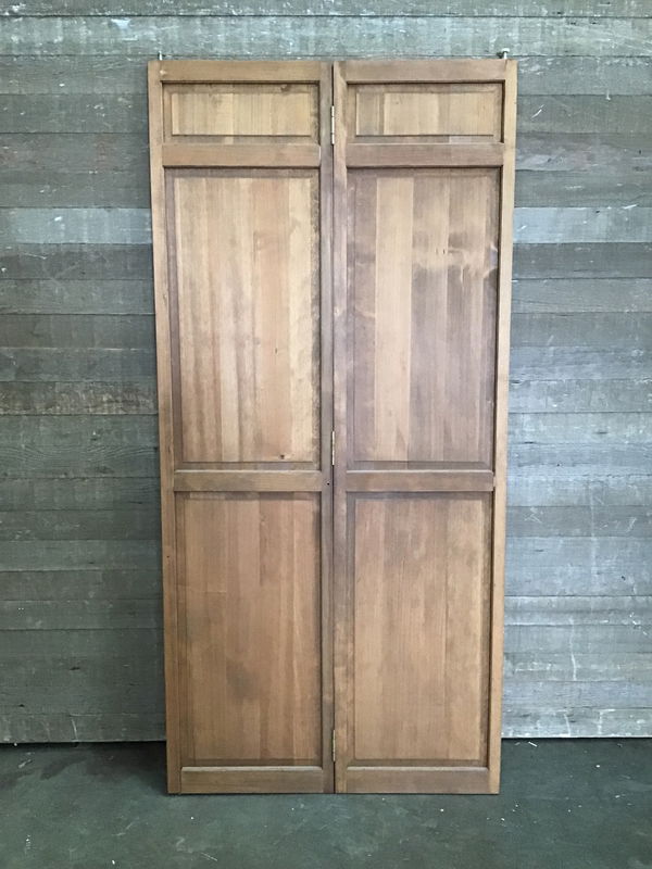 Wood panelled bi-fold door with tracking available in back upon purchase. Has been stained. In fair condition, looks like some of the panelling needs some repair as it's starting to come apart. And looks like there may be a split starting on one of the panels.