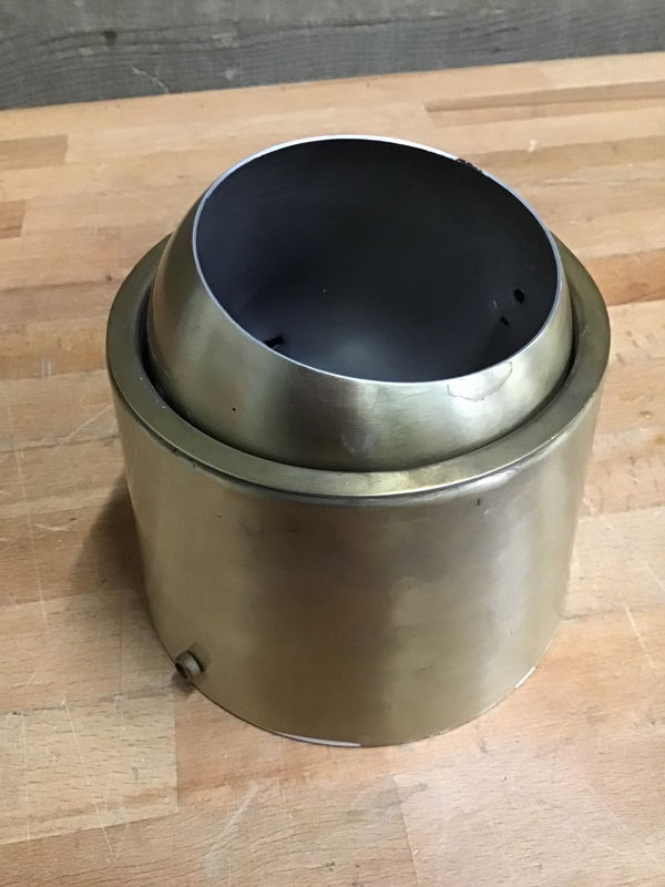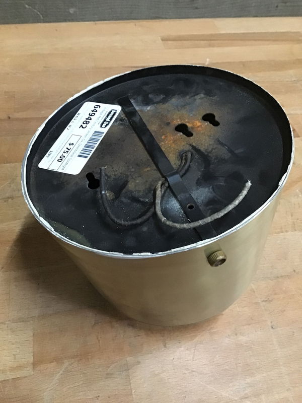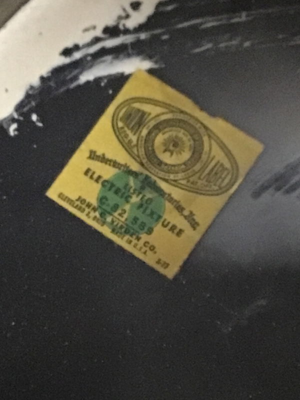 This is an awesome mid century directional spotlight made by John C. Virden Co. This "eyeball" style light is brass toned metal. A little dent in the rim, and is missing one of the wing nuts used to secure the "eye" and potentially a glass cover. Overall in good condition with the original maker tag inside.