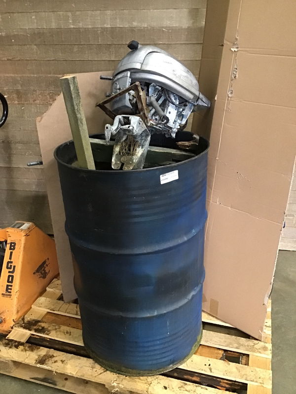 Unique vintage painted steel barrel planter with vintage outboard motor decoration. This hails from the local restaurant Boathouse 19 Bar and Grill! Full of soil, and ready for a plant of your choosing!