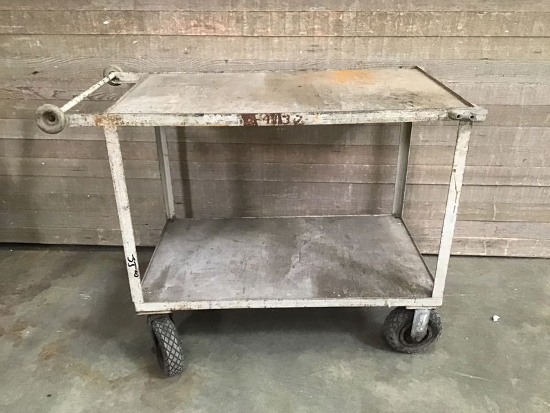 Steel frame cart with two plywood shelves. Painted and slightly rusty. Pneumatic wheels need a bit of air, but the casters seem to be in good condition otherwise.