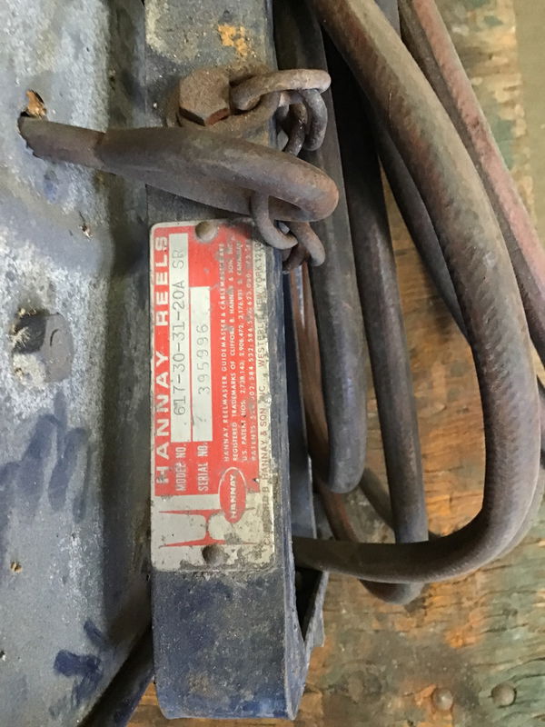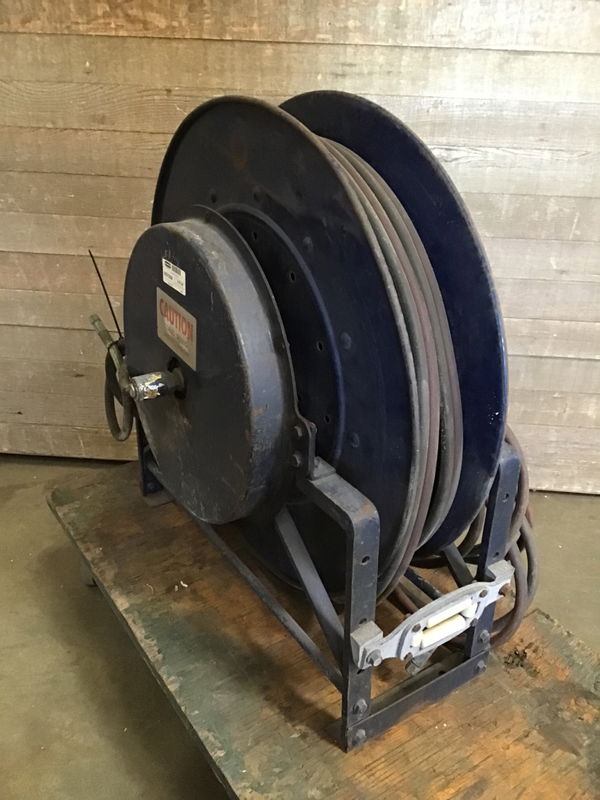 Industrial hose reel, manufactured by Hannay Reels. Model #: 617-30-31-20A SR and SN: 395996. Retractable hose reel, currently locked with a bolt-in bracket, just needs to be removed to use.