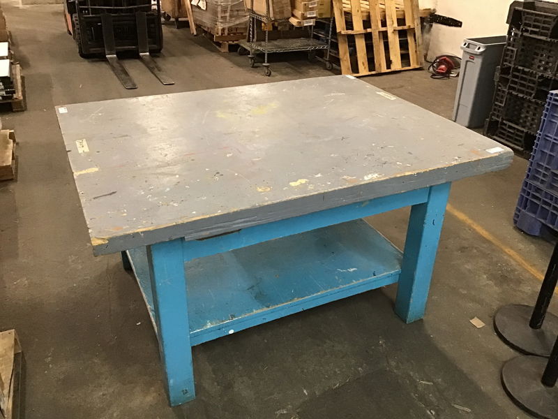 This mega-shop table came to us from a local high school and features a virtually indestructible wood top (it has already endured years of people trying to destroy it), has cutouts for vises on the corners, stout legs and bottom shelf tool storage. Whatever you are using this for, it will be a reliable workmate. Tabletop measurements without vices W:50'' L:63.5''
