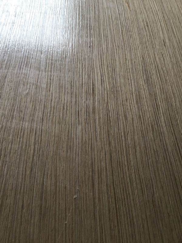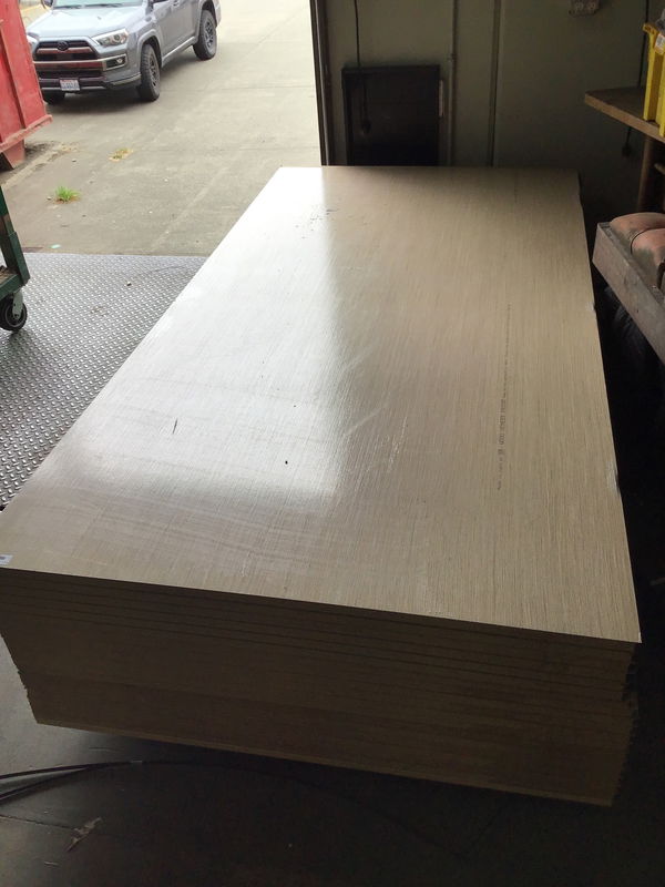 New White Oak veneer over laminate with plastic protective layer still on it. Veneer laminate made by ALPI Italy who makes some really high end veneer products. 1" cabinet grade Particle board, black laminate on other side. This is a bulk item. No holds please. Photo may be representational.