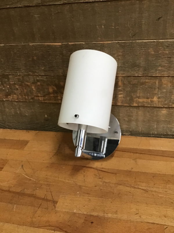 Bathroom wall sconce with a polished chrome finish and obscured glass shade. This is a high end Ginger branded light from their "Sine" collection. This light retails for over $150.