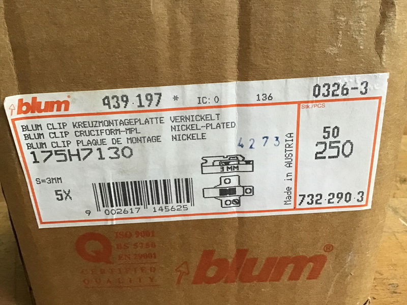 New Contractor Box of Blum, nickel-plated mounting plates. There are five boxes of 50, for a total count of 250. These sell at about $1 each online, see here.