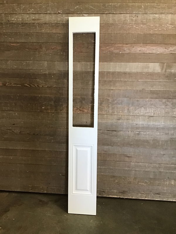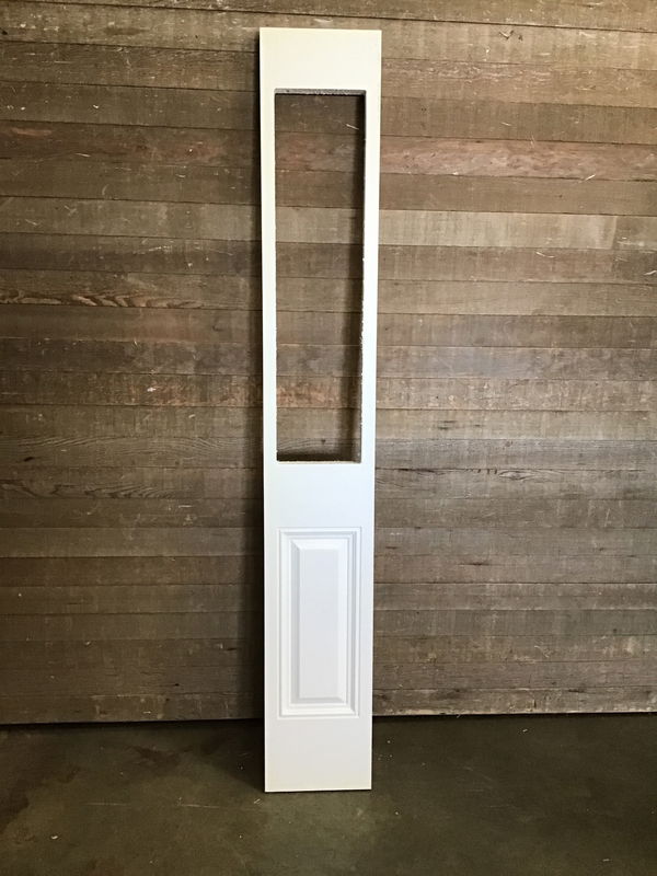 Never installed half lite style fiberglass sidelite with faux raised panel pattern missing its glass. Fit it with your own glass or plexi glass panes and get a nice sidelite for a great deal.