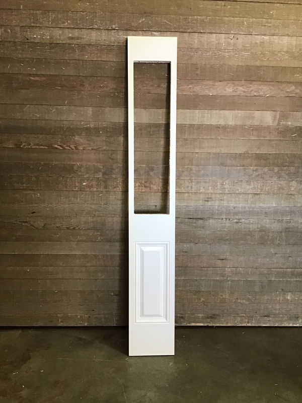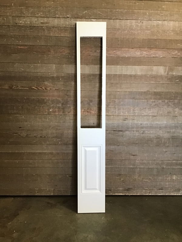 Never installed half lite style fiberglass sidelite with faux raised panel pattern missing its glass. Fit it with your own glass or plexi glass panes and get a nice sidelite for a great deal.