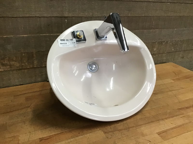 Porcelain light pastel pink bathroom sink in good used condition, comes equipped with a Grohe faucet.