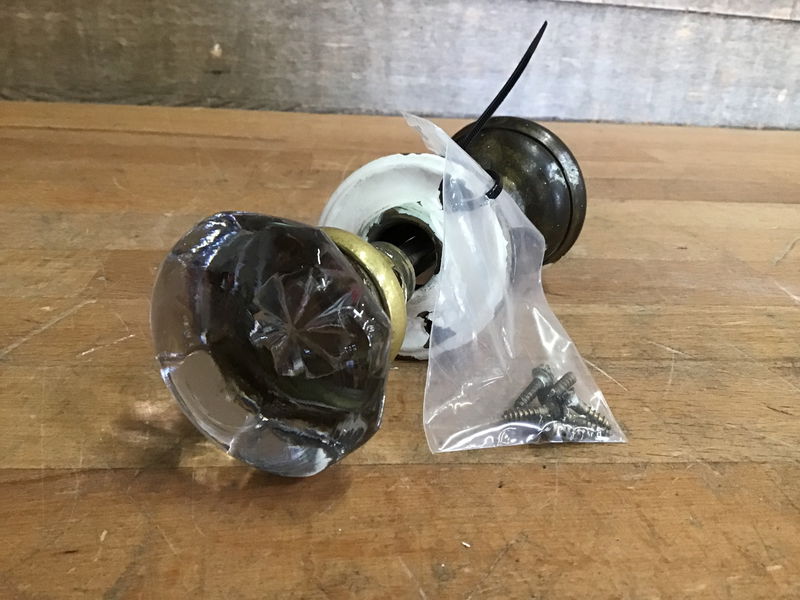 Pair of mix match vintage door knobs. One octagonal glass knob. One awesome brass knob. Includes spindle and set screws. Some paint residue on the brass knob but otherwise in great condition.