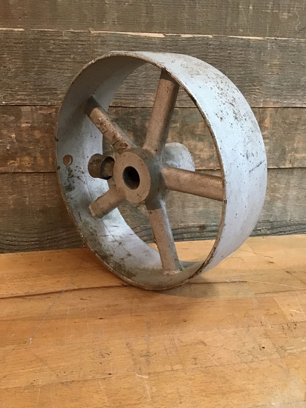 Check out this cool industrial flat belt pulley with a concave crown for self centering and a really cool self lubricating reservoir! Made of cast iron with a ~9.75" diameter 1" shaft bore. Go truly cottage core by converting your shop tools to flat leather belt drives because older is better, obviously. Would also make a great industrial decoration.