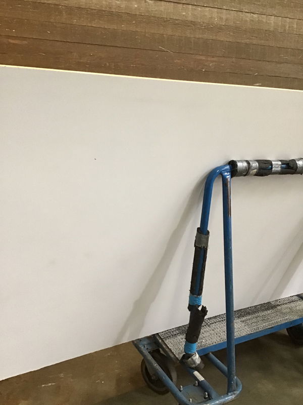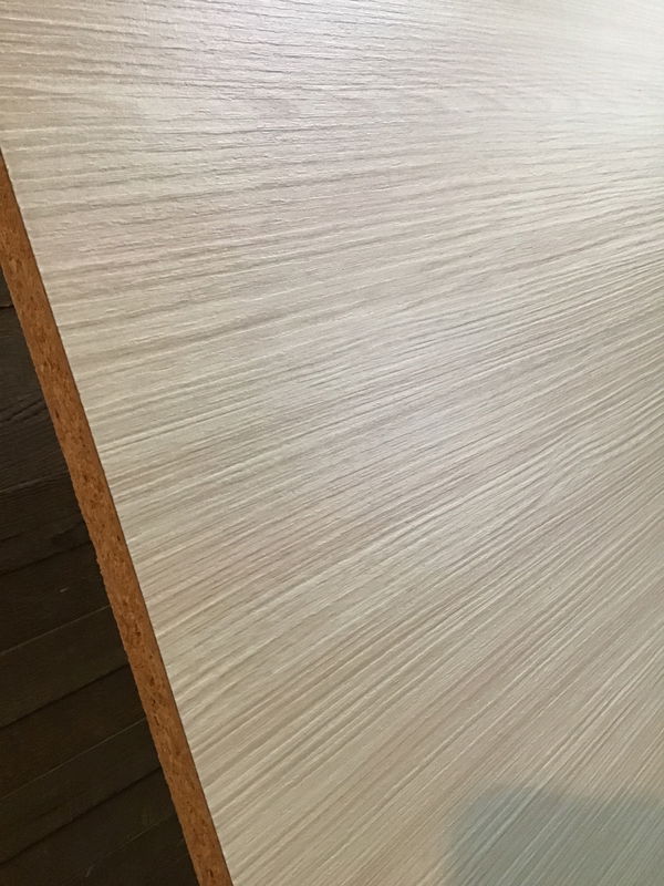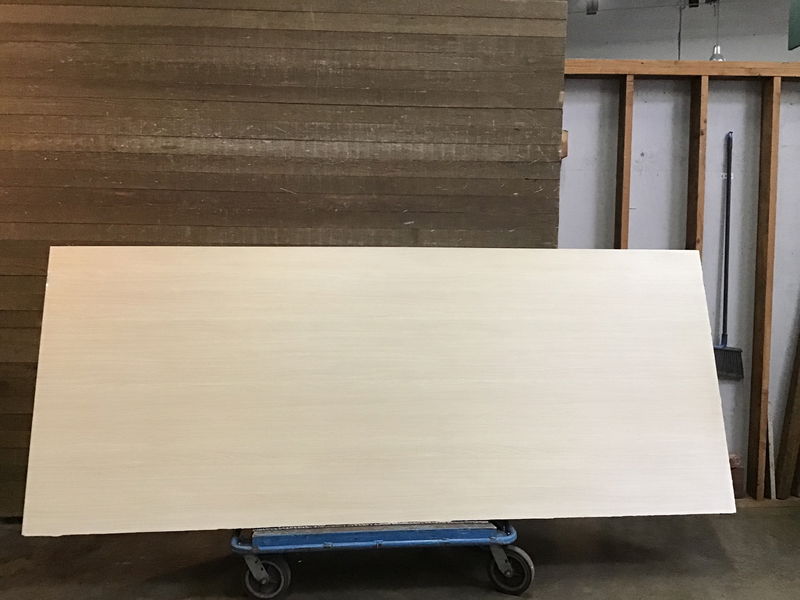 4'x10' particle board sheet with oak laminate on one side and white laminate on the other side.