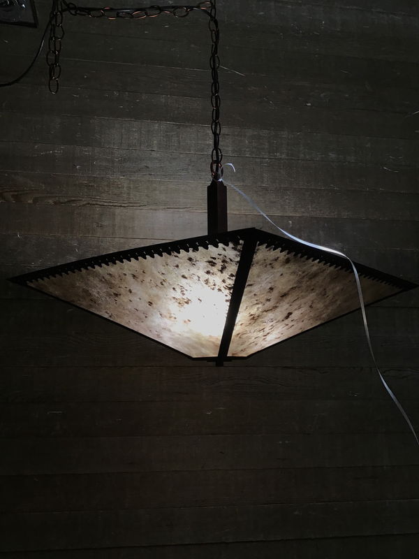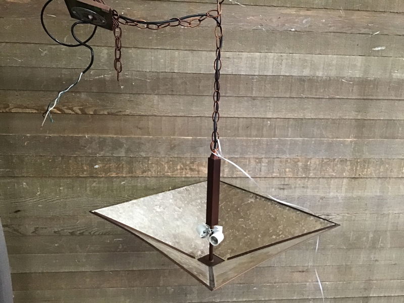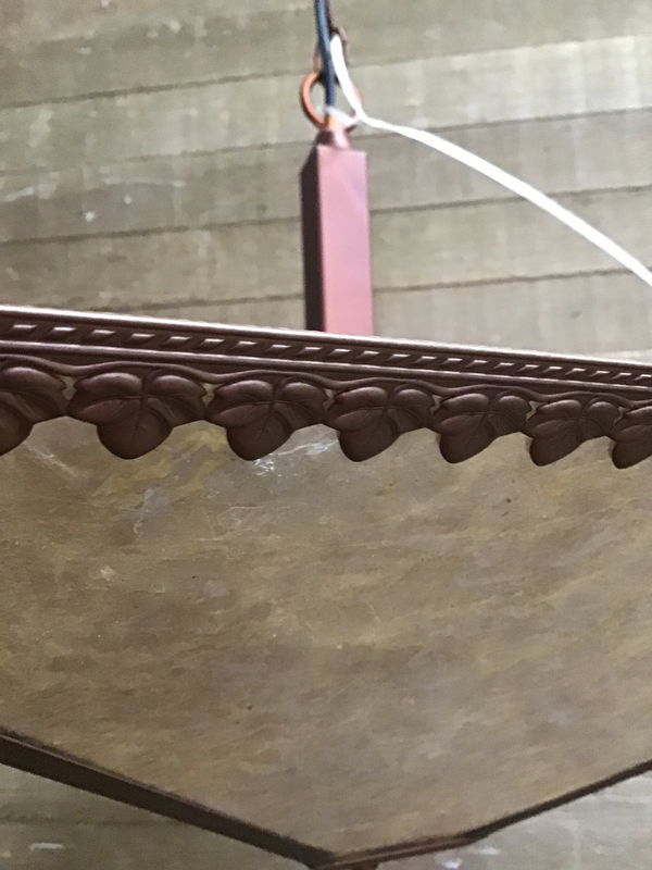 Cool pendant light fixture with a red metallic finish and tan toned panels. There are ivy leaves around the top edge of the light. The panels seem to be made of a laminate/man-made material. Height does not include roughly 51" of chain. Some of the chain will need to be rewoven with the wire.
