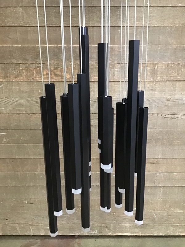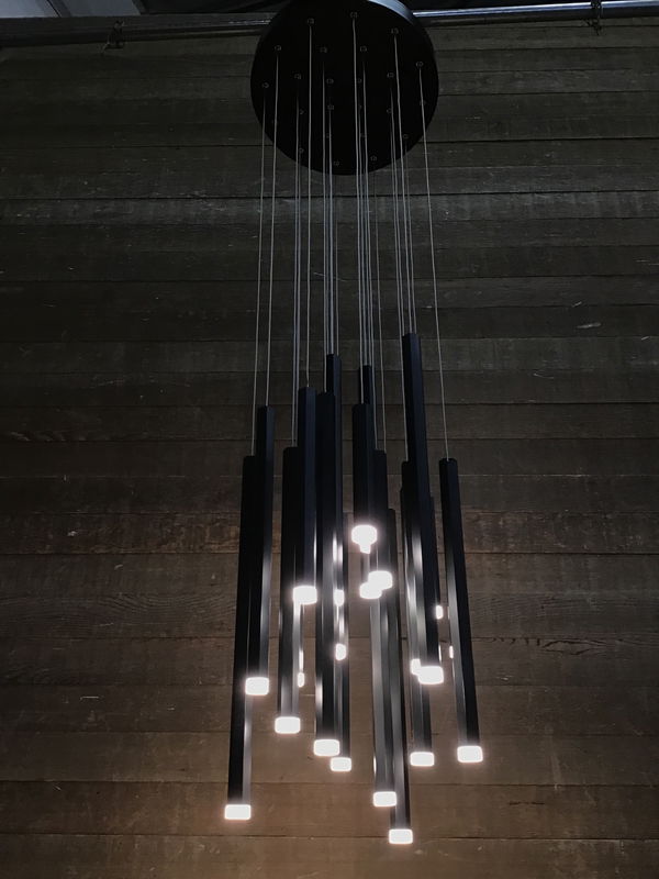 Kitchler LED Light fixture from their Soho collection. Dual function of light and sculpture, this wind chime-like ceiling light will impress anyone who sees it. 24 LED cylindrical pendant lights with a black finish, hang from cables at varying heights from a 15" diameter canopy. The tubes can be rearranged into any pattern that works best with your space. This high end light was a display in a light shop and never installed for real life use. Perfect for a large home, or a high end business!