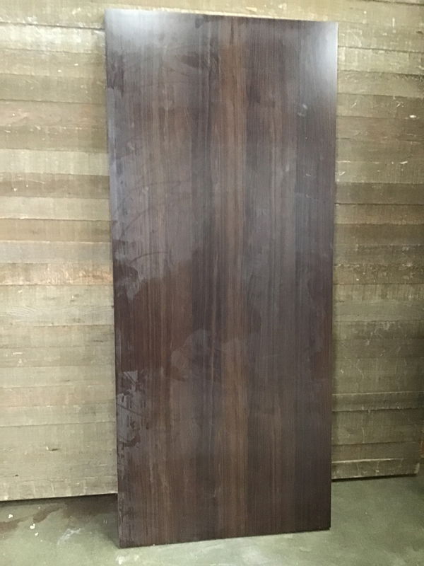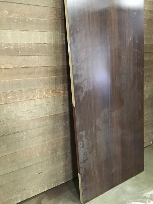 Commercial door with dark woodgrain laminate faces. Edges have partial laminate. Cutout on one edge for a latch. No hinge cuts. This would make a great desk top or work surface.