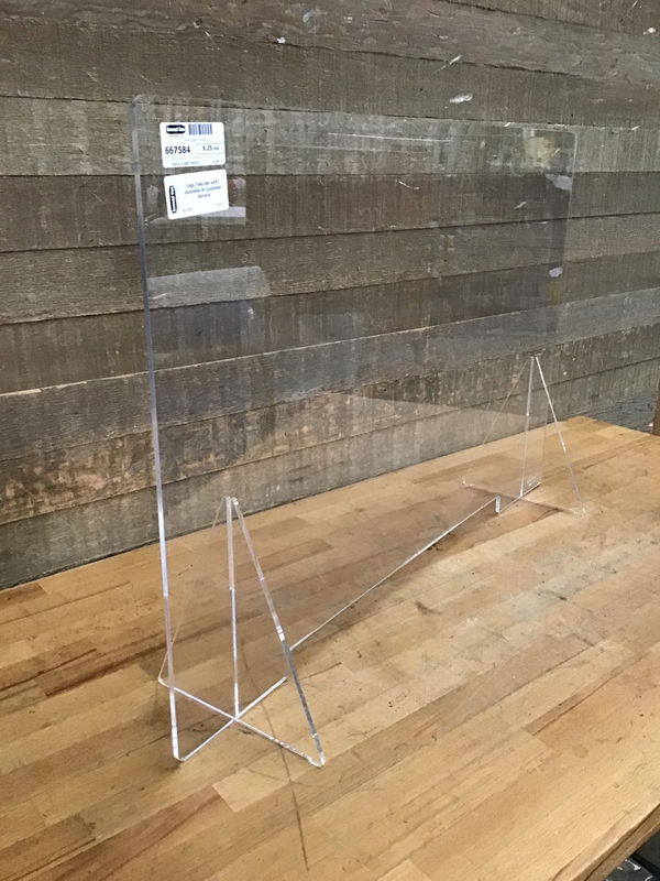 Plexiglas space divider, freestanding with two legs. This is a bulk item with two different heights, 23.5" and 35.5".