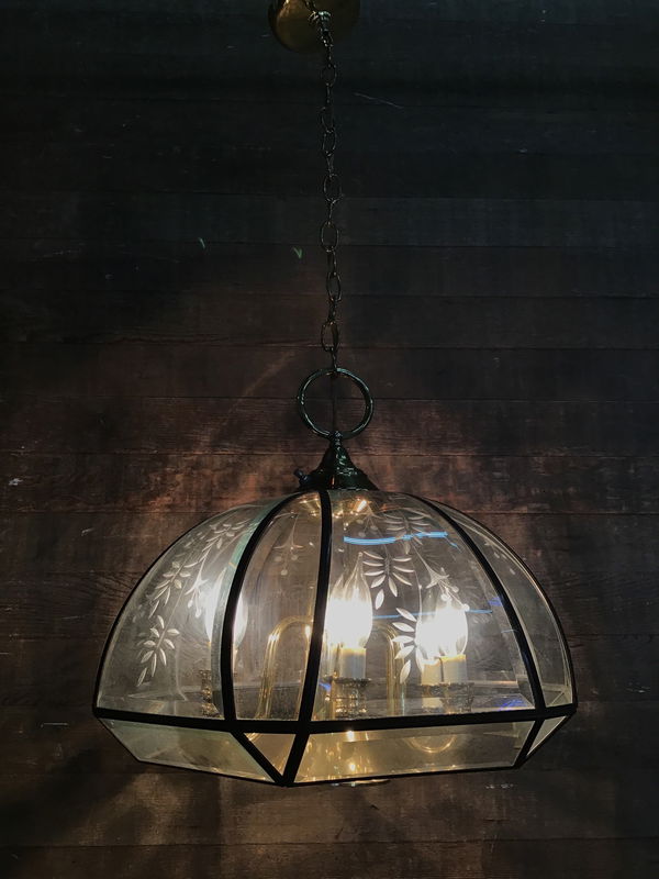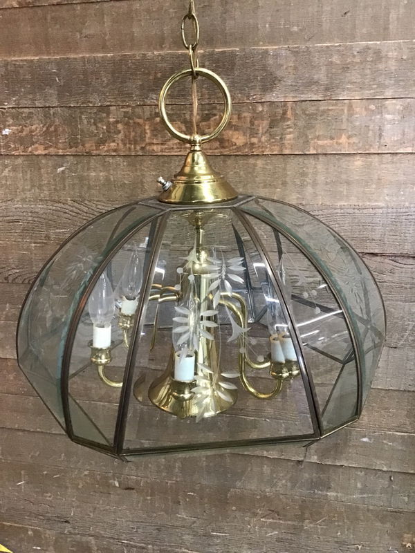 Fredrick Ramond 6 bulb chandelier in great condition. Featuring 24 panes of beveled glass in an umbrella over a 6 arm brass finish chandelier. The largest panes have botanical etchings. Wiring is great and tested in house, though we always recommend a full test before permanent installation. Has about 1.5' of chain.