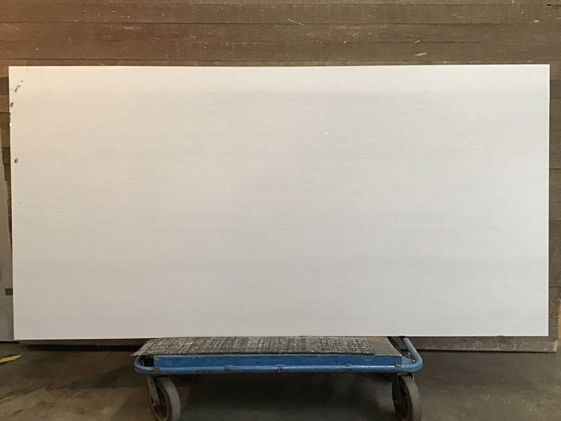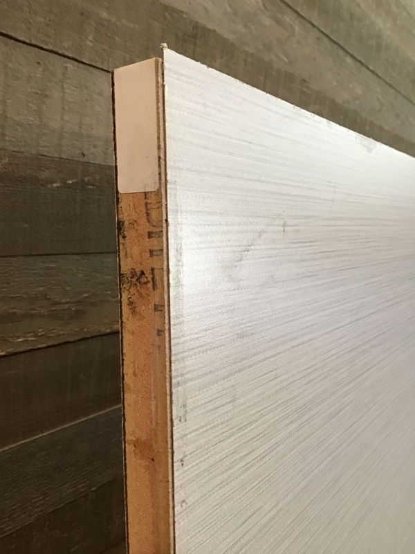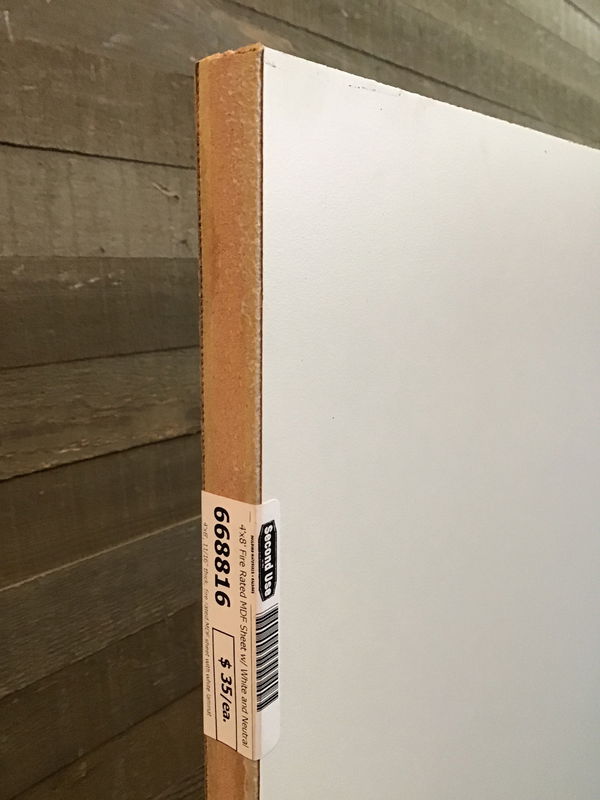 4'x8', 11/16" thick, fire rated MDF sheet with white laminate on one side and 'neutral twill' laminate on the other. Looks to be in overall good condition! Photo may be representational.