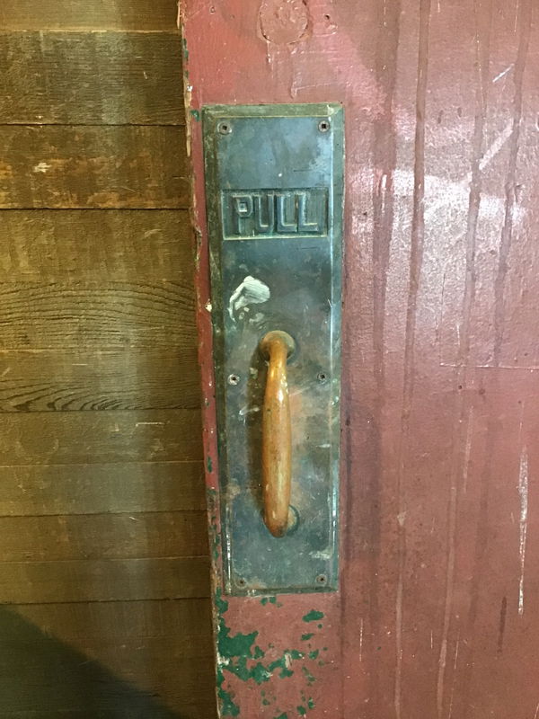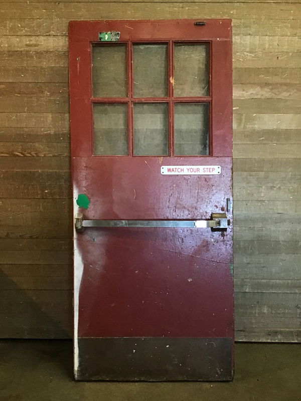 Hefty vintage school door with 6 true divided glass panes. No cracks! Panic bar and door pull have a nice vintage look. Expected cosmetic wear for its age otherwise structurally sound.