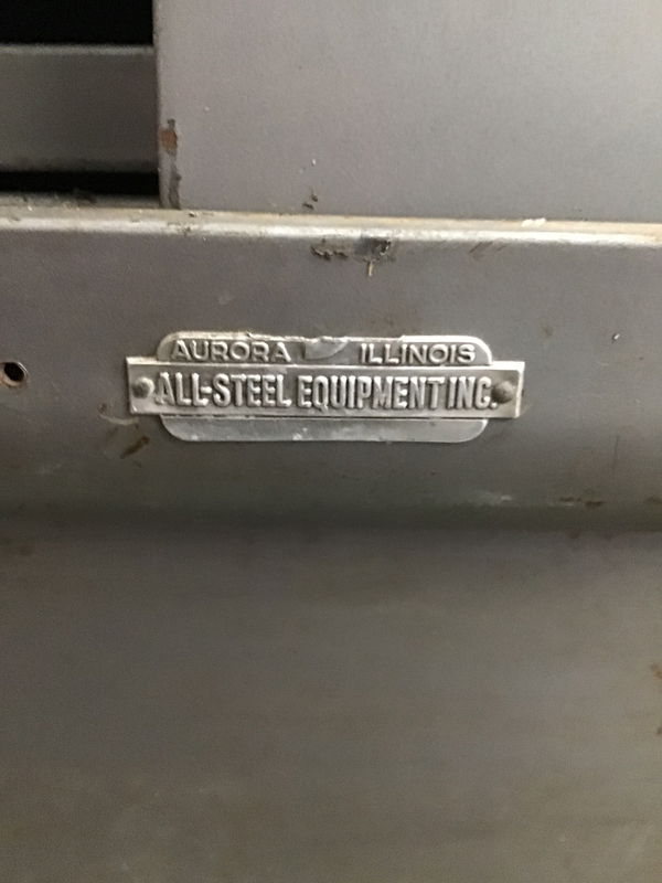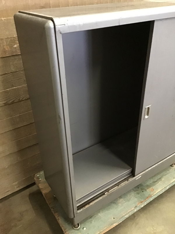 Snazzy looking MCM steel cabinet with smooth rolling doors and two internal adjustable shelves. Right side has no face so could be installed against a wall or purchased together with its matching side inventory number: