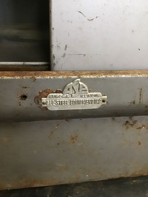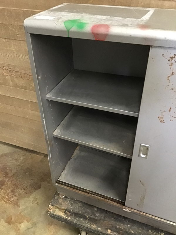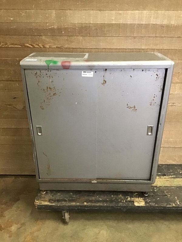 Snazzy looking MCM steel cabinet with smooth rolling doors and two internal adjustable shelves. Left side has no face so could be installed against a wall or purchased together with its matching side inventory number: