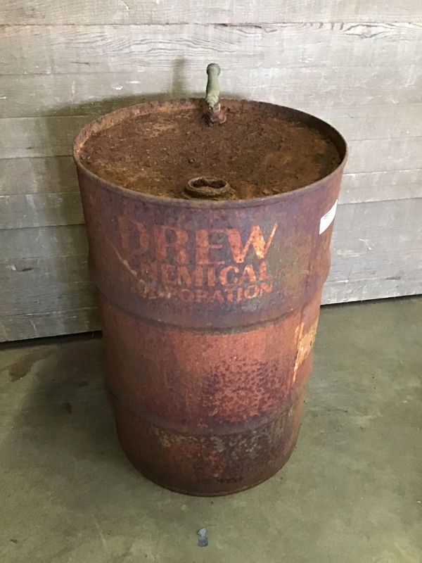 Empty rusty steel barrel with "Drew Chemical Corporation" printed on the side. The base of the barrel looks sound, but there are a few holes in the lid. Would make a great rust-ic decoration.