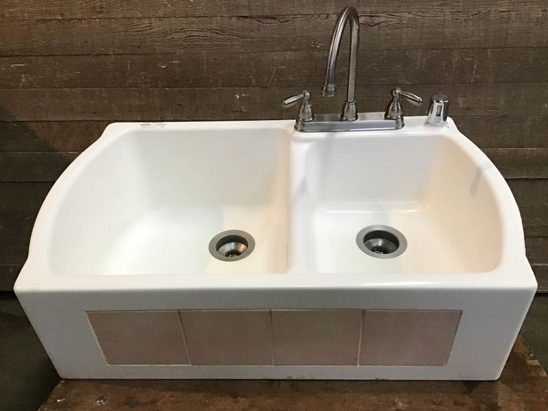Beautiful American Standard farmhouse style sink. High/low bowl design. 9-inch left depth and 7-inch right depth. Previously installed but in awesome shape. No cracks or major scratches. Its 4 subtle pink tiles on its face add a very cute unique look to it.