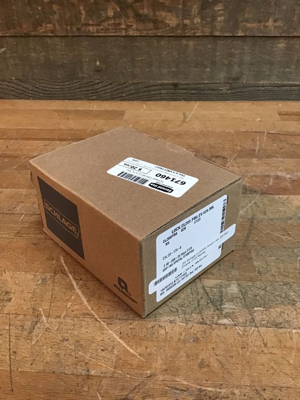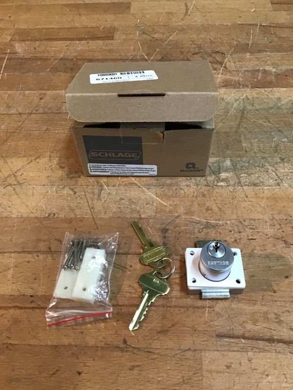 New in box Schlage cabinet lock with key in a satin chrome finish. Model number CL200PB626