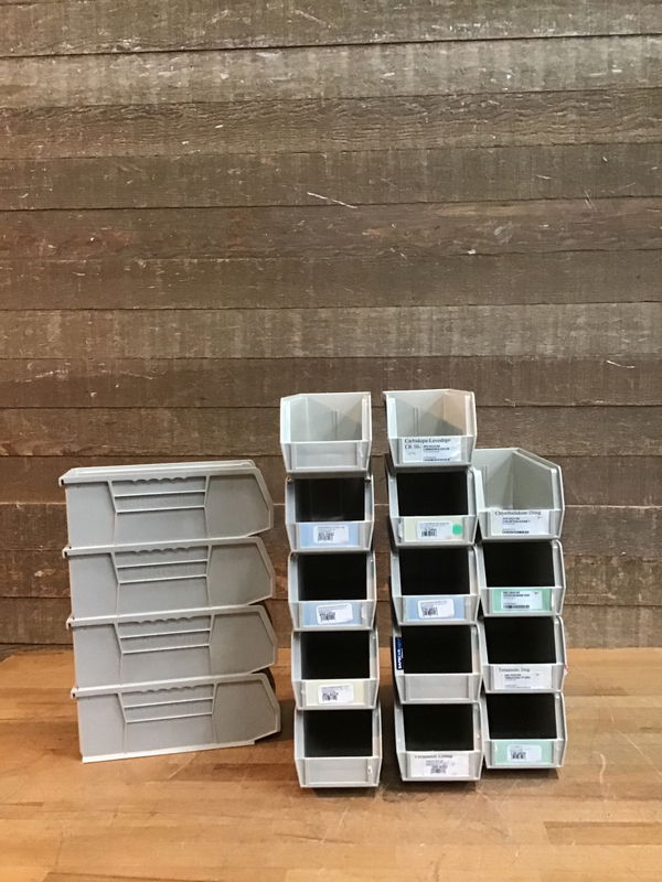 Stackable bins with label holders and inserts by Arko-Mils. Looks like they were previously used in a pharmacy. This is a bulk item. No holds please.