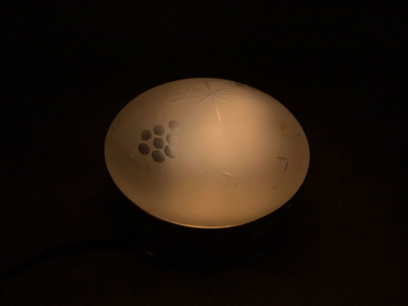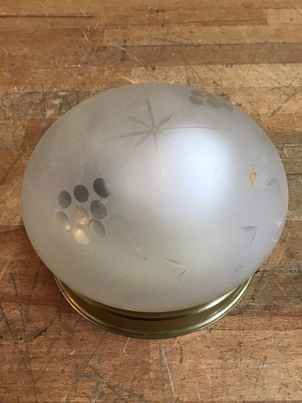 Sweet midcentury flush mount light with etched glass shade and brass fitter