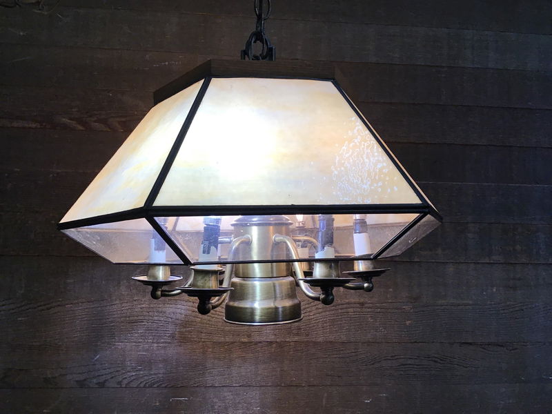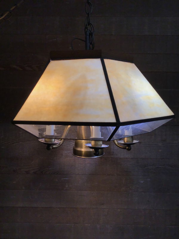 Vintage Lavery Co. hanging light with slag glass and clear glass panels. This takes one regular bulb in the center and 6 candle size bulbs. There is a little switch in the center that allows you to control which combination of bulbs light up. There is about 5' of chain, not included in measurements listed. Though we were able to light it up in house, we recommend a full test prior to installation.