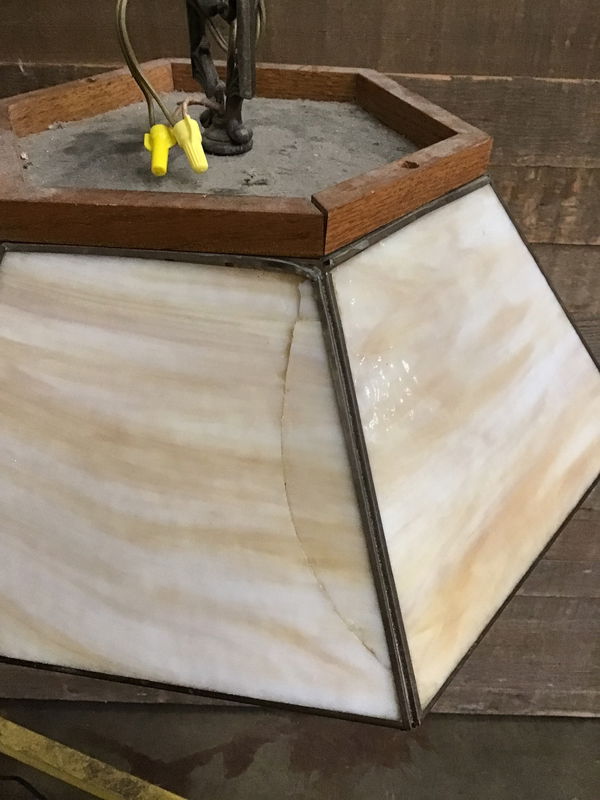 One of the slag glass panels has cracked, though it seems to be in no danger of falling out. One candle bulb does not light up. Price reflects damage.