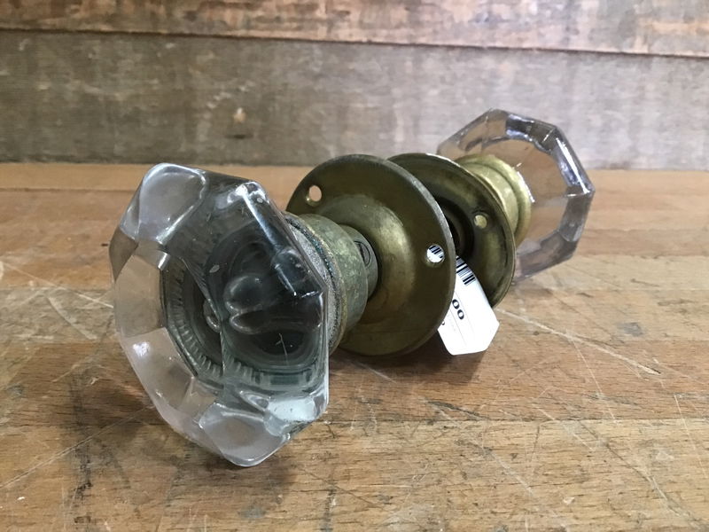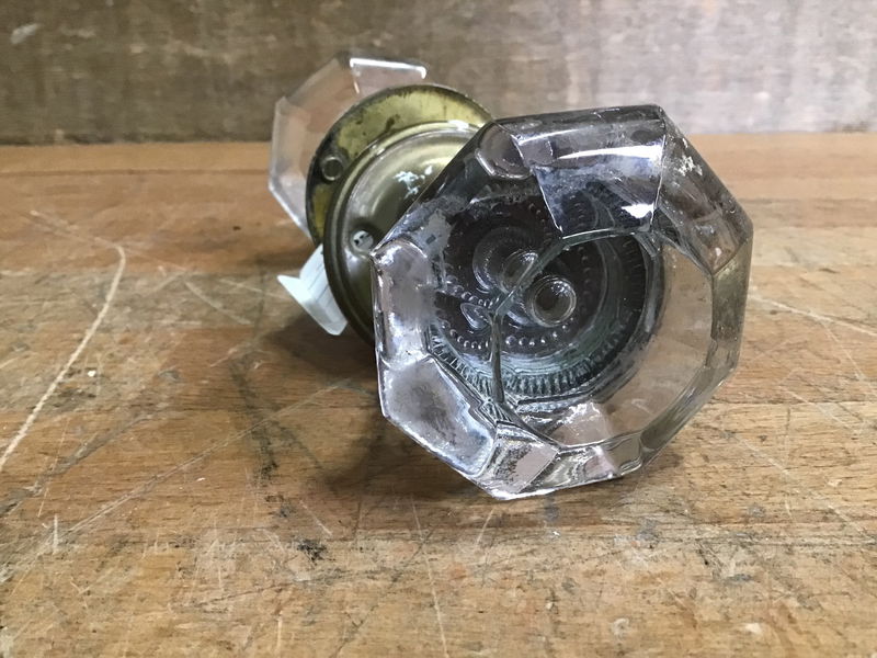 Vintage octagonal glass knob pair with brass bezels and rosettes, in very good vintage condition.