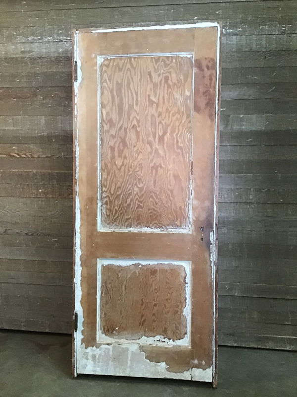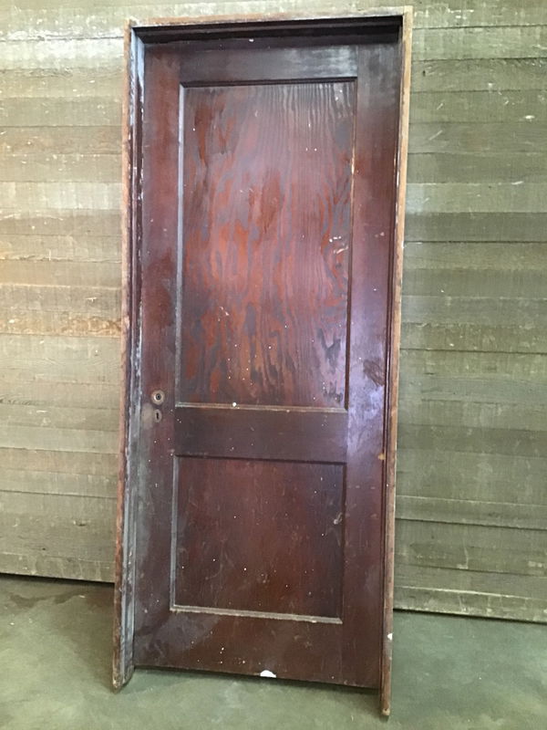 Vintage fir, richly stained on one side, sanded of paint raw wood on the other, pre hung interior door.