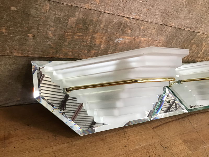 Forecast Lighting wall sconce with a beveled mirror back and brass features, and frosted glass shades diffuses light from a 75W halogen light bulb. Halogen not being the safest option out there, we recommend rewiring this unit. Bracket is included. Dated 1988 on the glass shades, and 1999 on the back of the fixture. If you'd like to get this light rewired at Second Use, please check out our Seattle in-house ligting services.