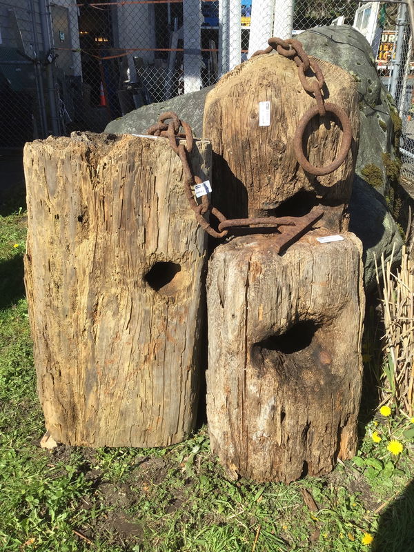 A classic Northwest coastal look: three rounds of rustic Fir with teredo clam bores & a hefty nautical wroughtical chain. Heights are roughly as follows:: 48" x 39" x 31". Average width around 20". This raw stock fir comes from coastal boom logs..... the same type of wood, Teredo Fir, we have been merchandising as paneling, bookmatched sets and live edge lumber. Sold with 8ft rustic boom chain that ties the three pieces together. Incorporate a bit of local history into your yard!