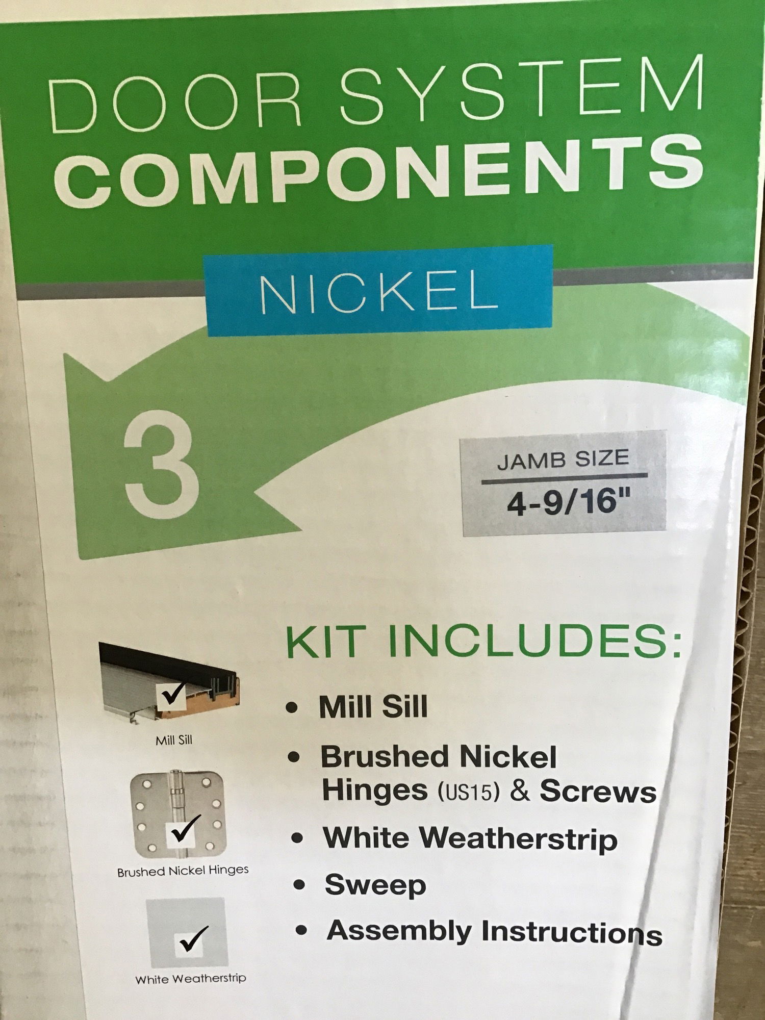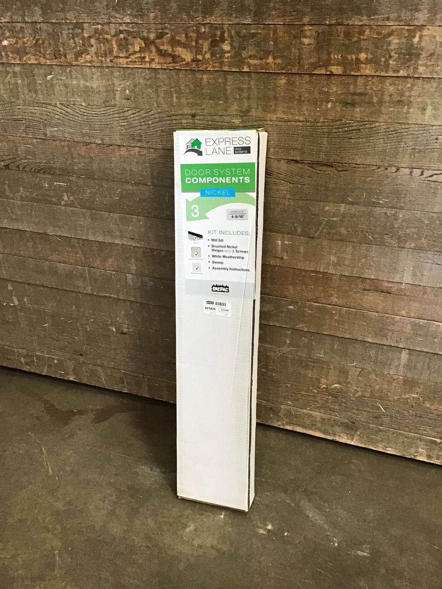 New in box, door system components kit with a nickel finish. This fits 4-9/16" jamb size doors. Kit includes: mill sill, brushed nickel hinges & screws, white weather-strip, sweep, and assembly instructions. Photo may be representational.