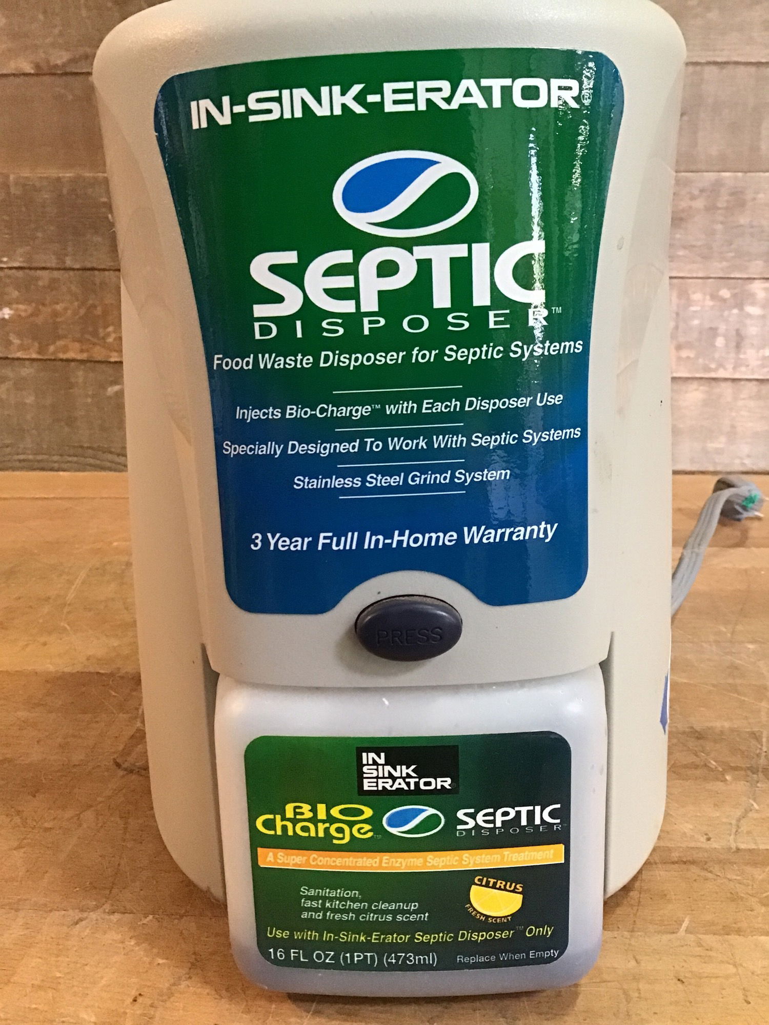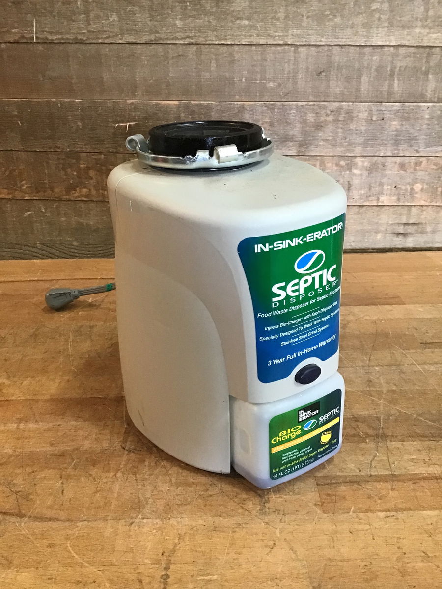 In-Sink-Erator septic disposer with bio-charge system treatment. Powered on in house and appeared functional.