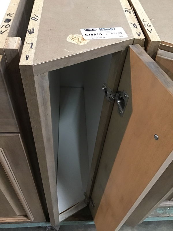 Angle front narrow sheet pan cabinet, medium antique stain on maple.