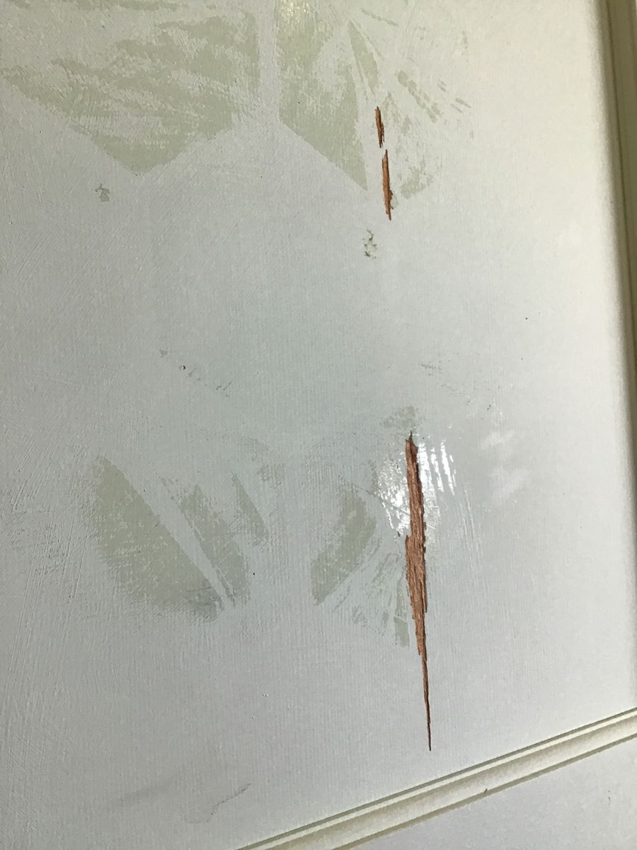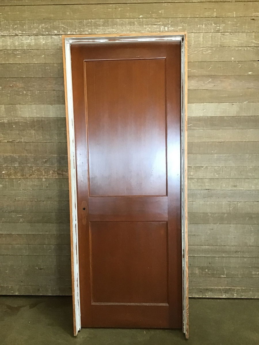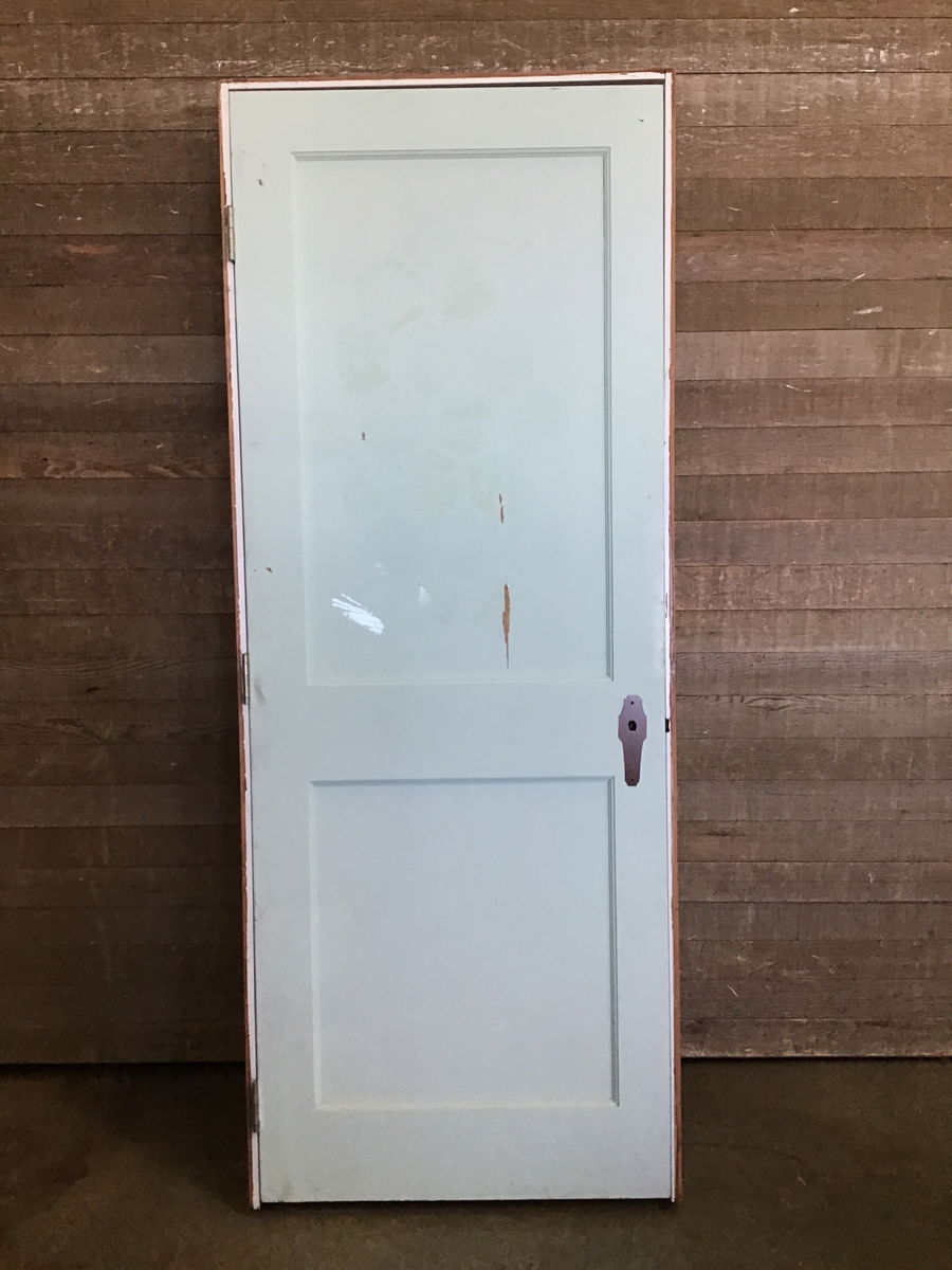 29" vintage pre-hung 2-panel interior door with right hand swing hinges. One side is painted and one side has a nice dark stain. Some minor cosmetic damage otherwise jamb and door are in overall good condition!