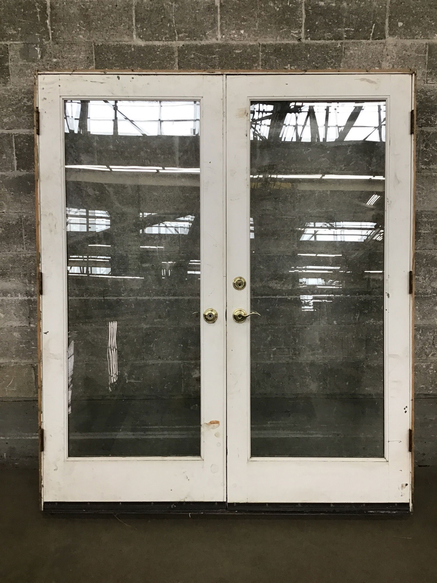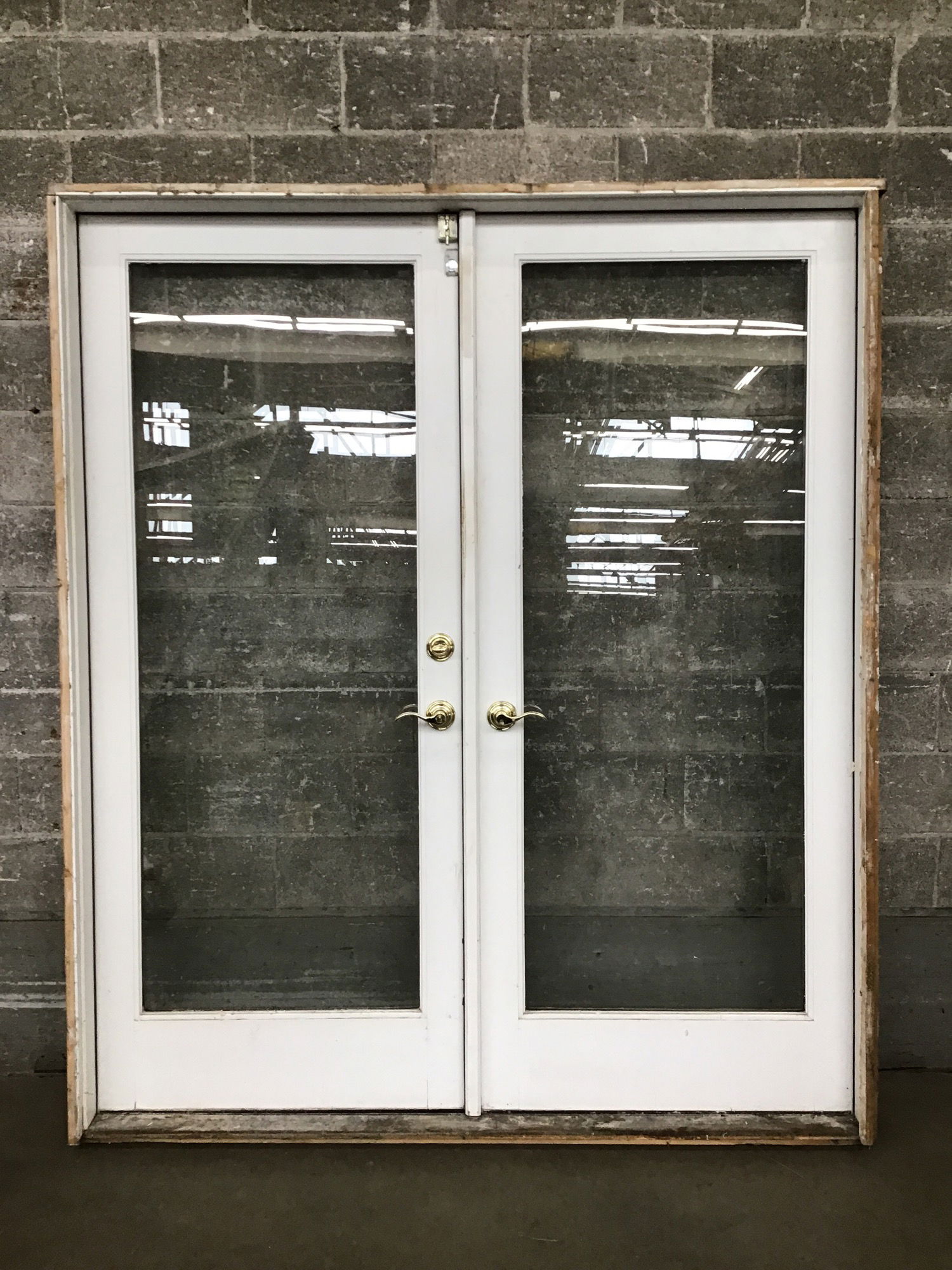 68" Exterior Double French Door that is quite dirty, but is totally reusable under that grime. Has most of a bright brass knobset and deadbolt but is missing one handle.