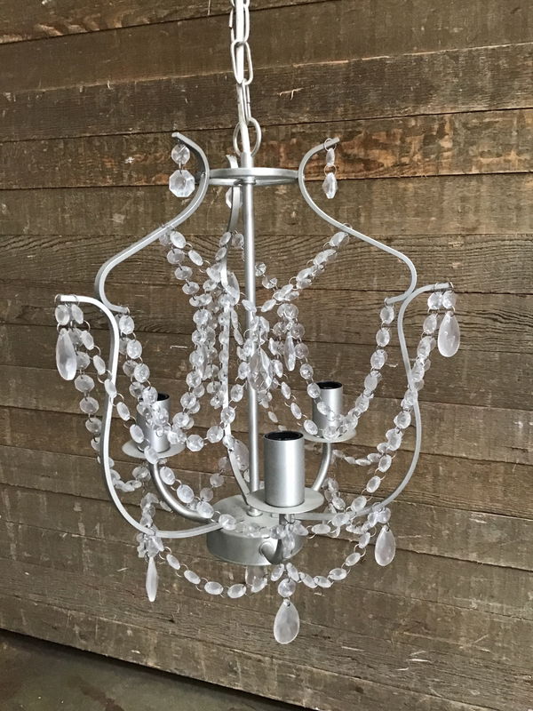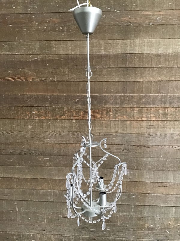 IKEA Kristaller plastic crystal chandelier in good, used condition. Looks like all the crystals are present. Takes three chandelier/candle style bulbs. Canopy is adjustable, and there is about 10" of chain.