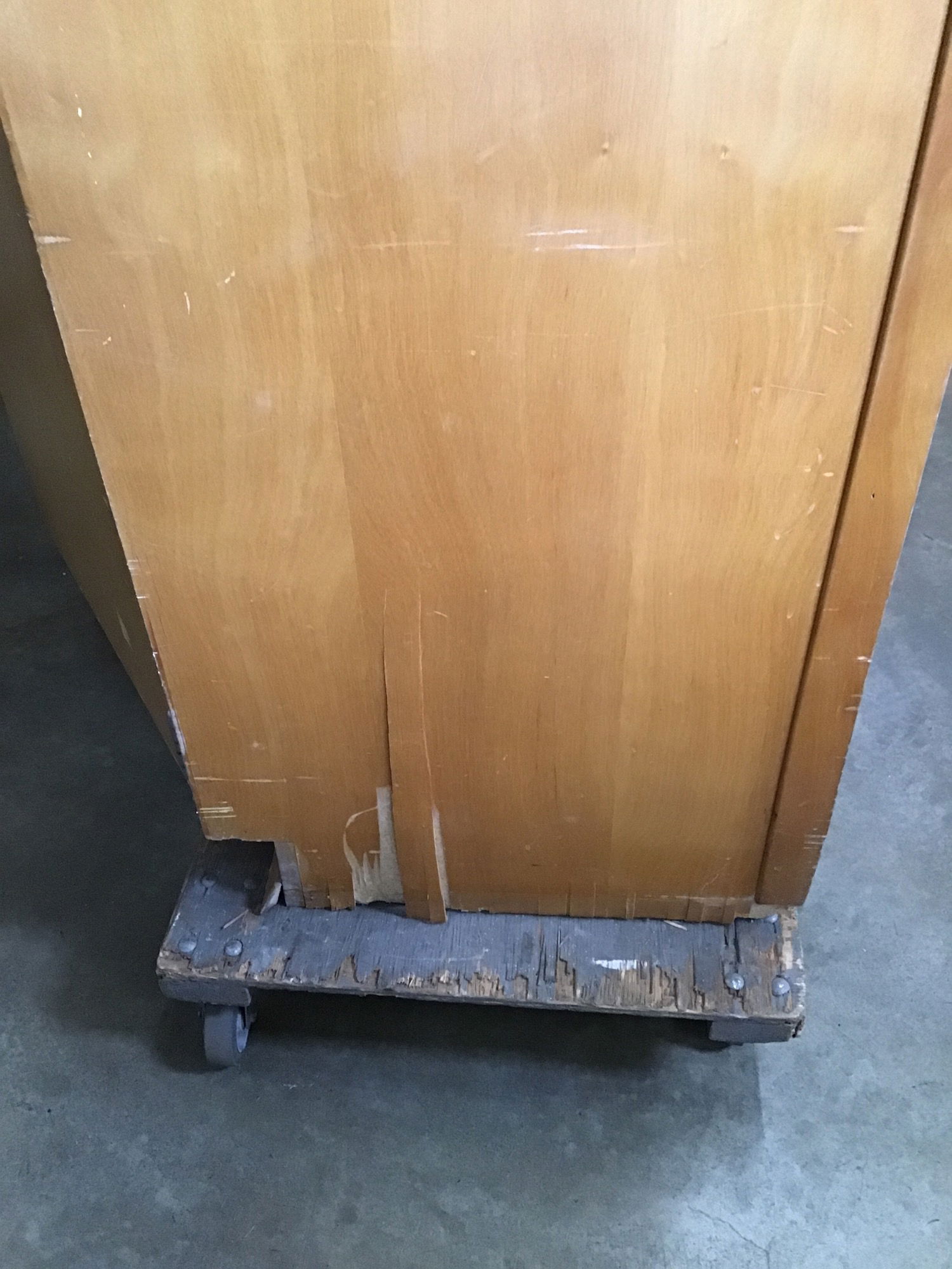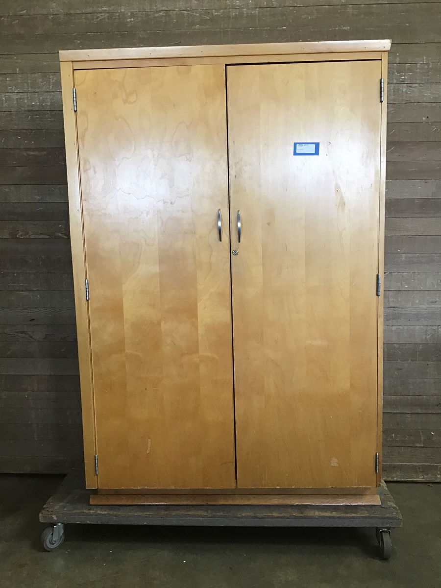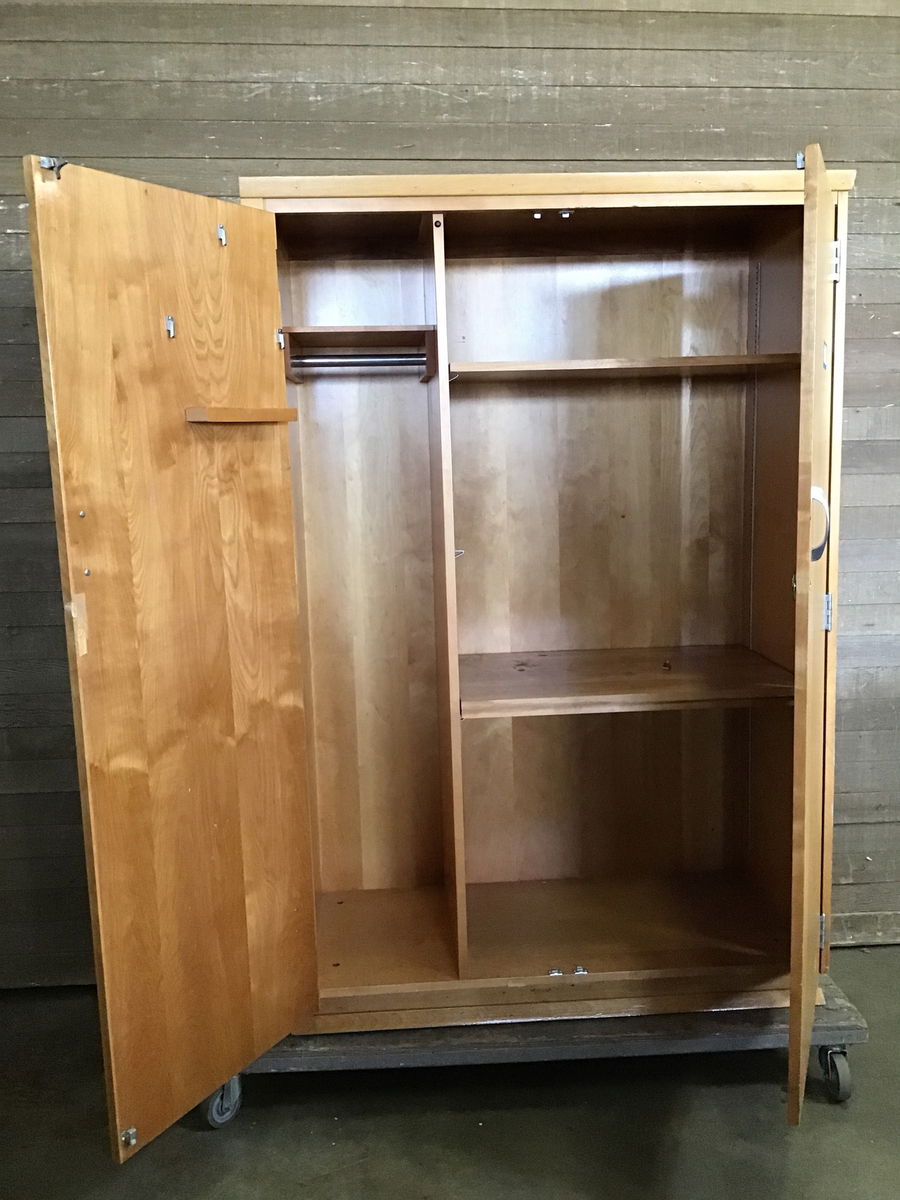Maple shop cabinet from Rainier Beach High School. Solid wood face, particle board box build with maple veneer. Includes several adjustable shelves and a coat rack. Has some obvious damage to veneer on sides but is in overall good sturdy condition. Would be great in a garage or craft room.