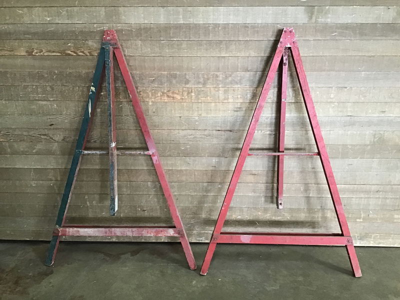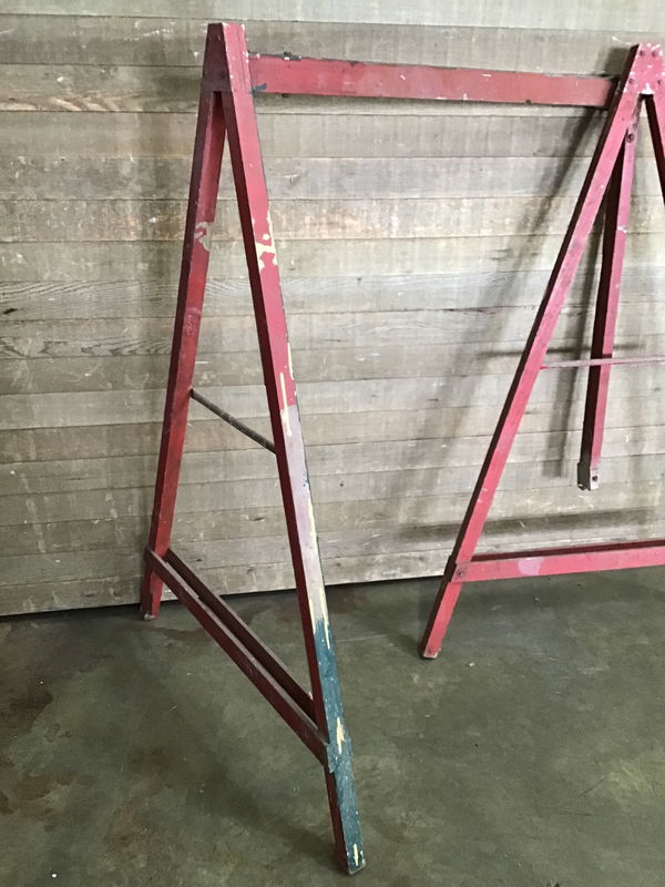 Two vintage wooden A-frame racks that can be moved and collapsed. We're not quite sure what the original function was, but they look like they're made to latch on to a support piece and provide a hanging rack or extra support. Height is 58.5", when extended the depth is 42"