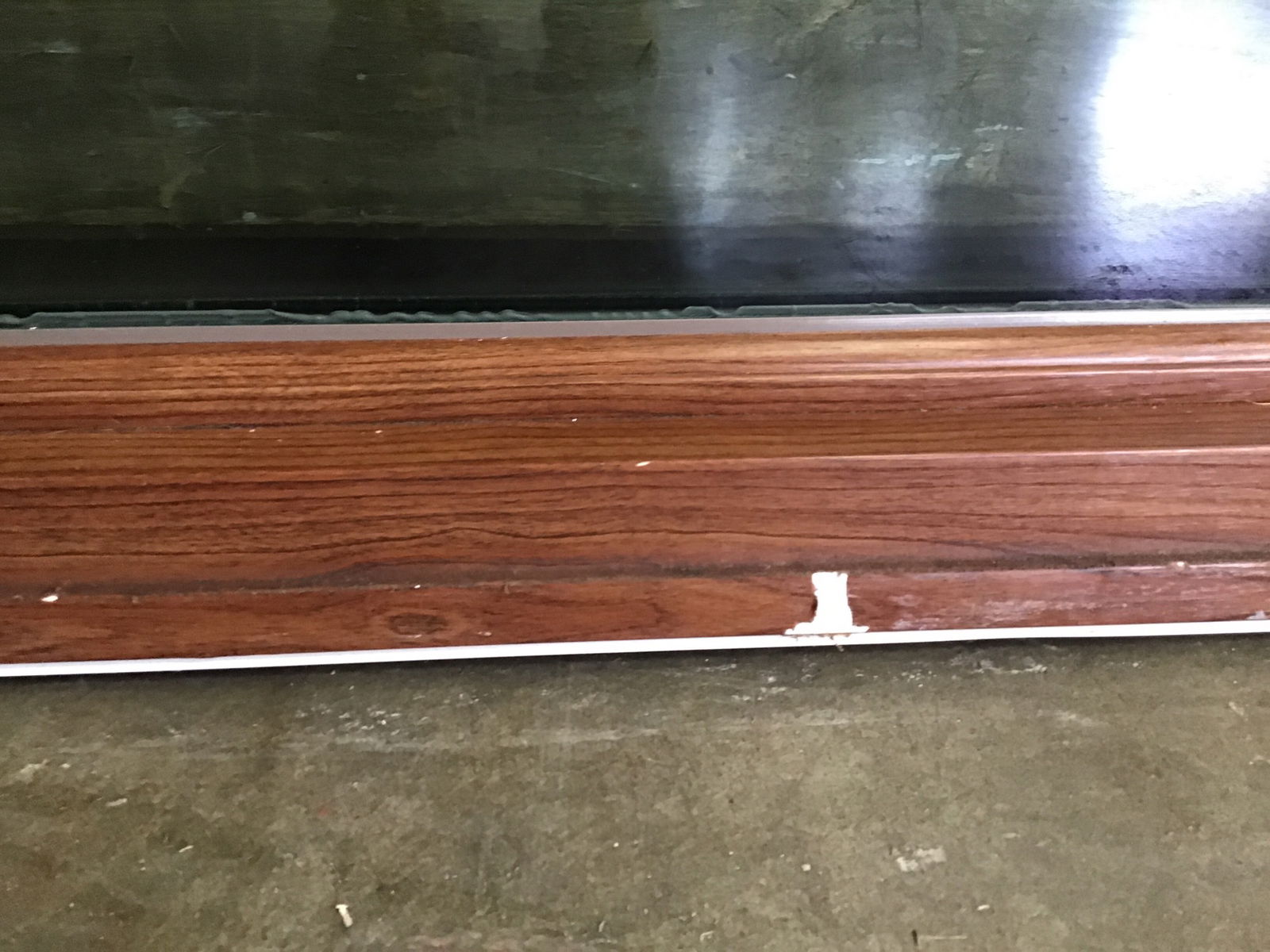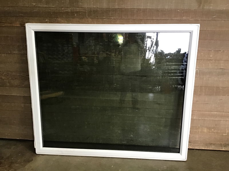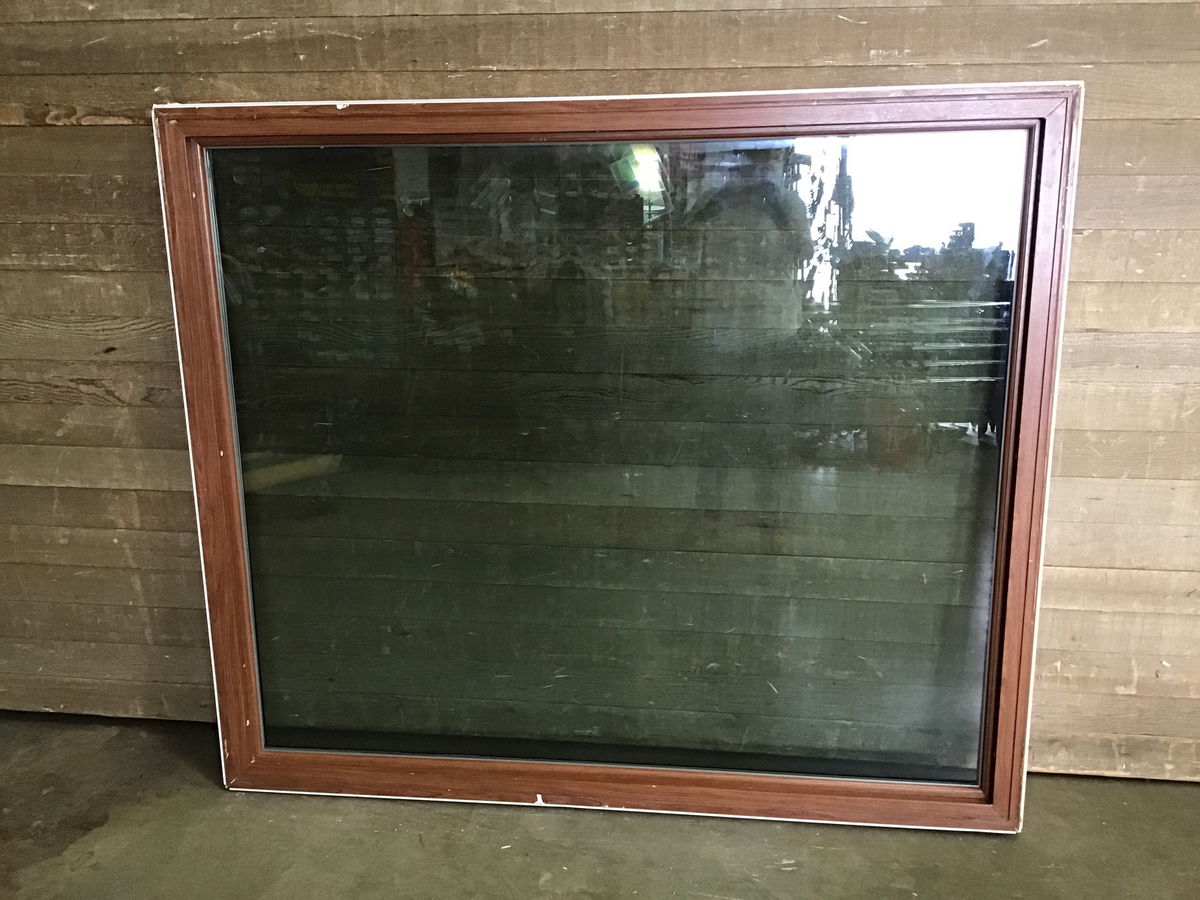 Vinyl fixed window, white on one side and a faux wood wrap on the other. There is some minor cosmetic damage to the wrap, but is overall in great condition. We're pretty sure we got the right orientation, but we are not 100% sure without weep holes.