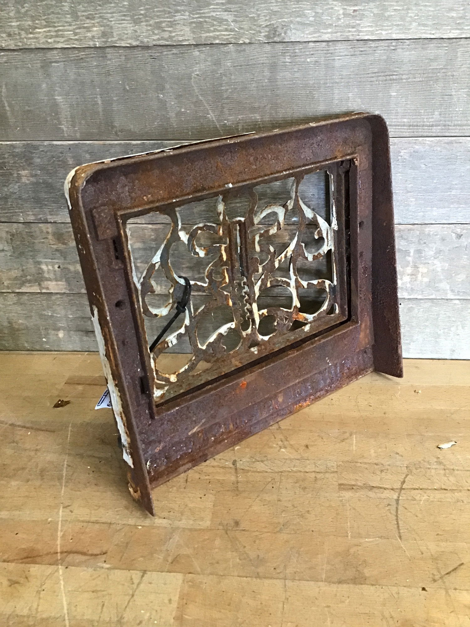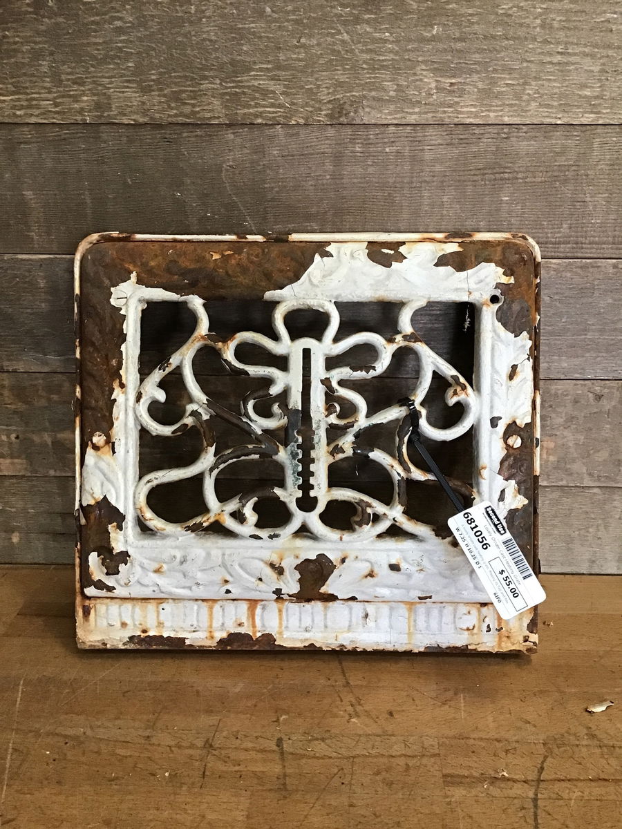 A lovely ornate cast heating grate. Missing its flap and has some chipping paint. Grate itself is in good condition and will look absolutely amazing after a little clean up and maybe a coat of paint?