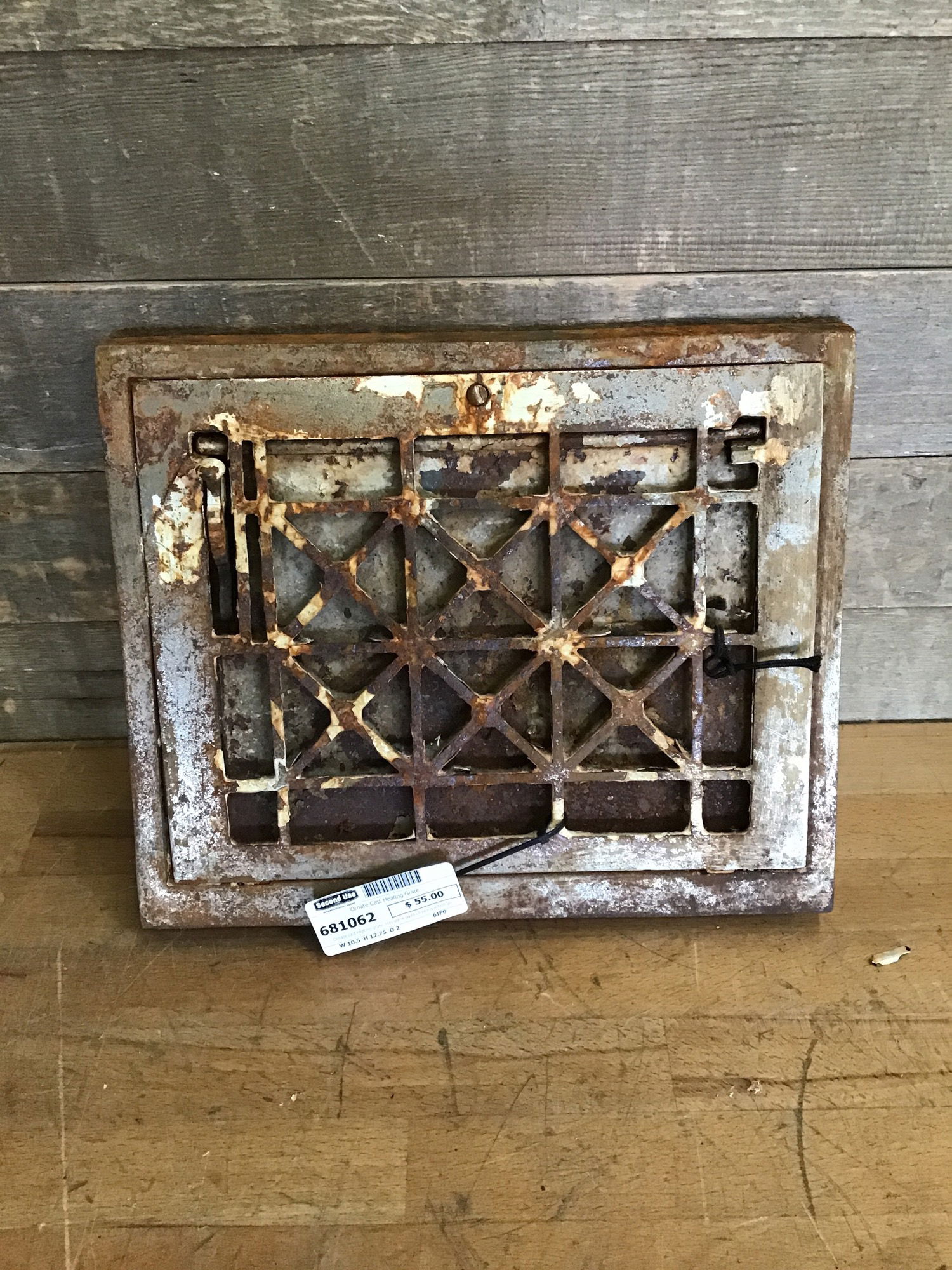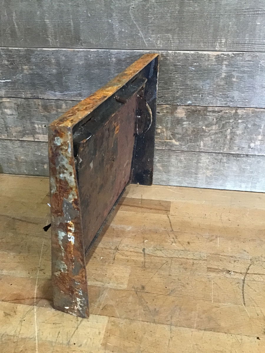Ornate cast heating grate. Has some paint chipping action going on. Grate itself is in good condition and flap is operable. Will look great after a little clean up!