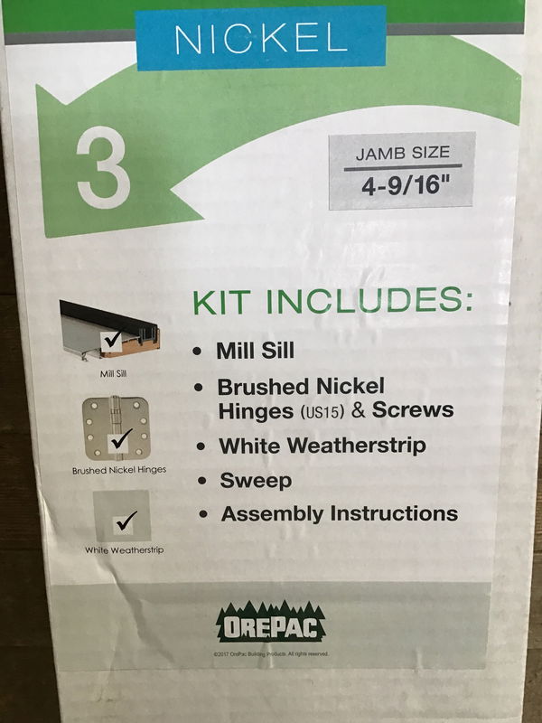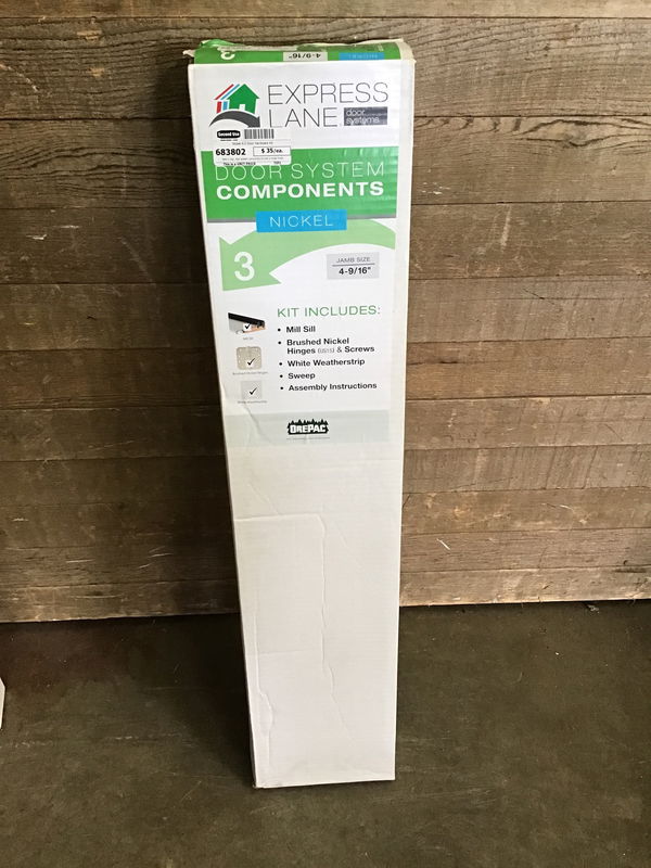 New in box, door system components kit with a nickel finish. This fits 4-9/16" jamb size doors. Kit includes: mill sill, brushed nickel hinges & screws, white weather-strip, sweep, and assembly instructions. Photo may be representational.