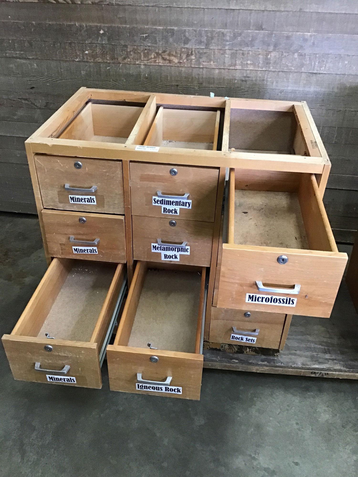 Formerly used in a local middle school, this Birch cabinet with 12 drawers would be a great addition to your shop! Features nickel pulls and the drawers are lockable, though no keys are included. One drawer is a little off and will need to be adjusted.